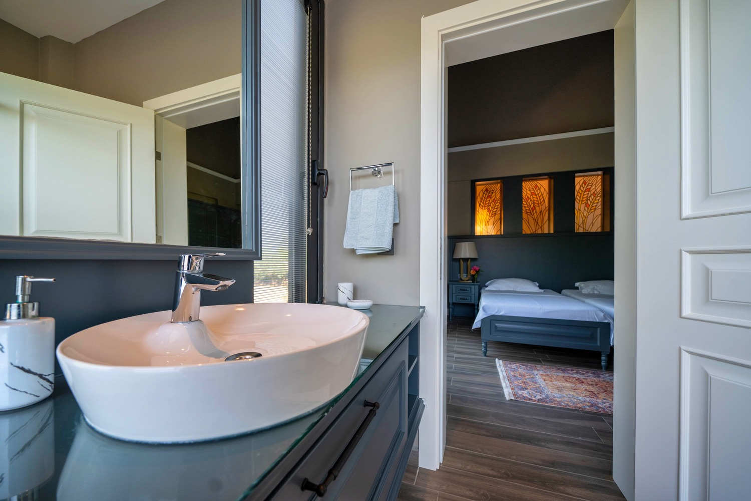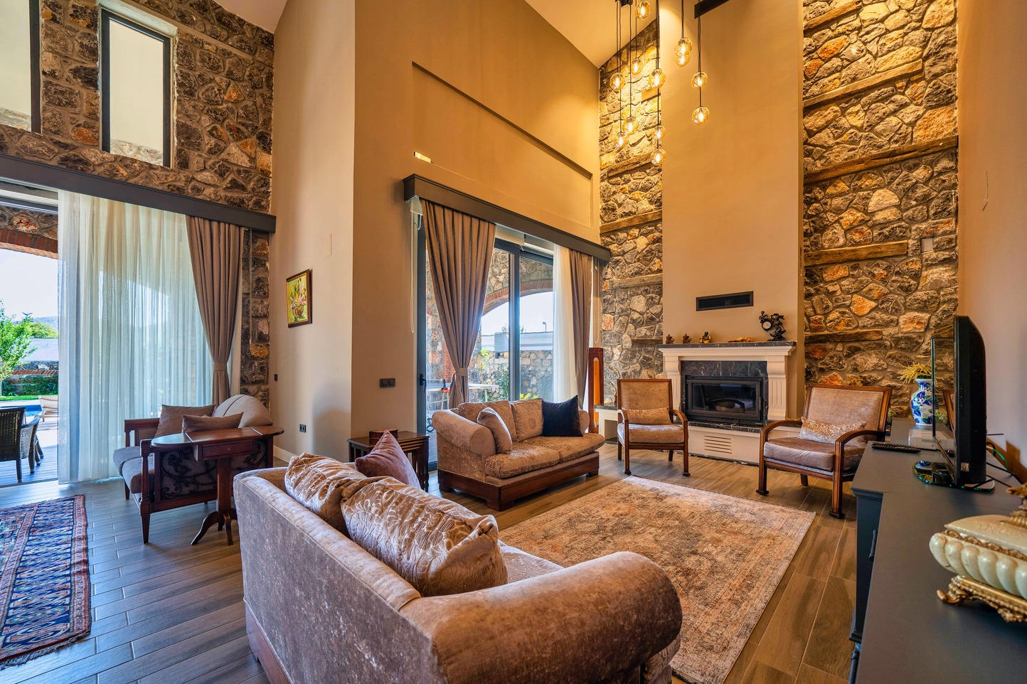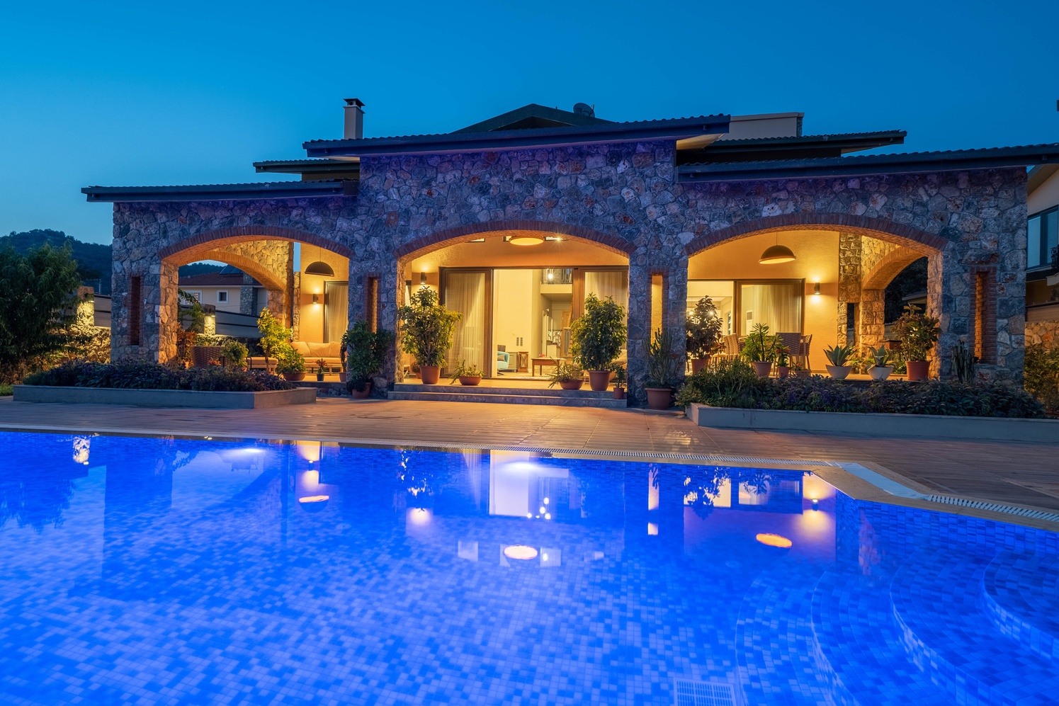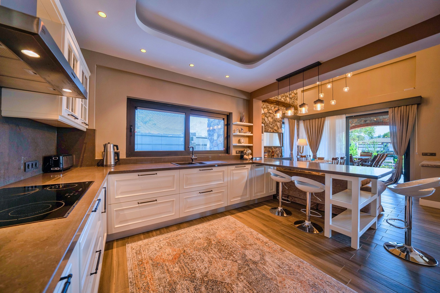 2 Storey Villa with 355m2 usable area in a 1000m2 garden. 220 / 220 Recreation Pavilion, 11.50m length 5m width 1.60 depth; Heated Pool. Villa Kuzey with 3 bedrooms, 2 bedrooms 180/200 beds, 1 bedroom 2 beds 100/200 (combined upon request) suitable for 6 guests. One bedroom has a jacuzzi, each has an en-suite bathroom and 12 btu air conditioning.