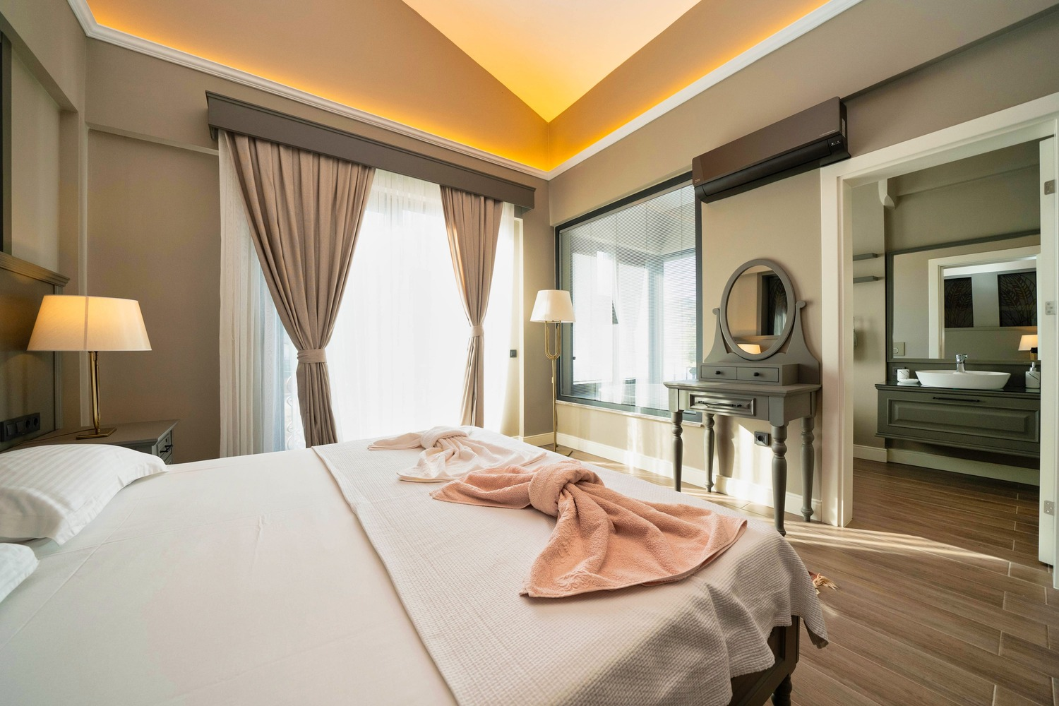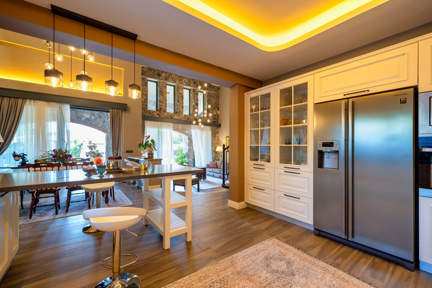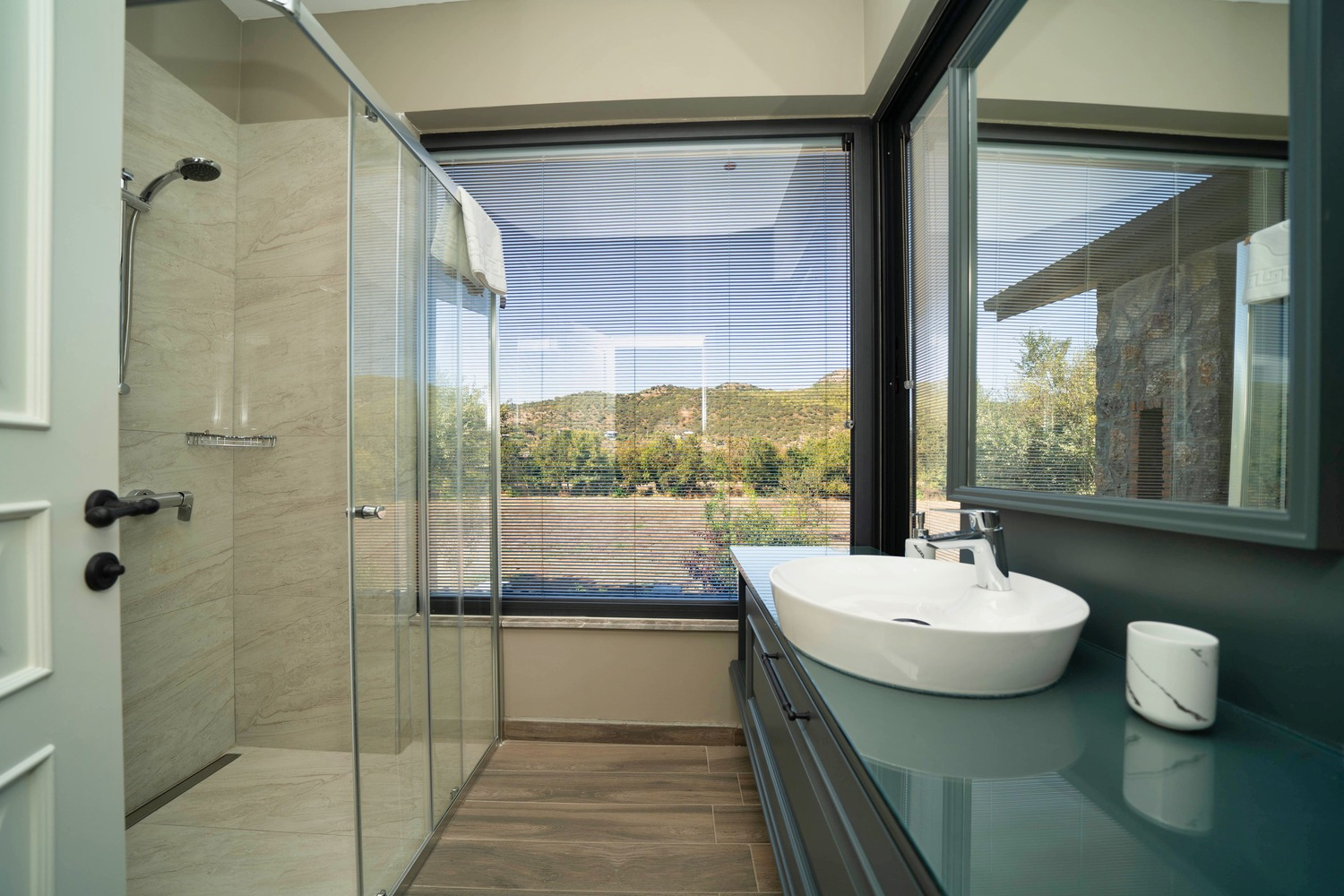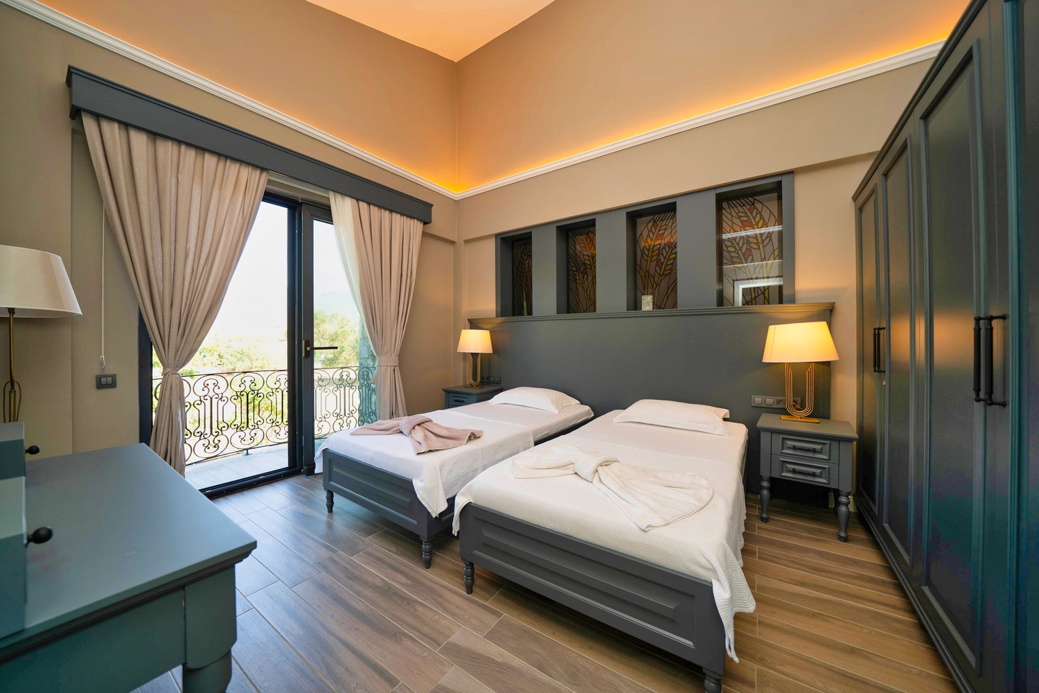 2 Storey Villa with 355m2 usable area in a 1000m2 garden. 220 / 220 Recreation Pavilion, 11.50m length 5m width 1.60 depth; Heated Pool. Villa Kuzey with 3 bedrooms, 2 bedrooms 180/200 beds, 1 bedroom 2 beds 100/200 (combined upon request) suitable for 6 guests. One bedroom has a jacuzzi, each has an en-suite bathroom and 12 btu air conditioning.